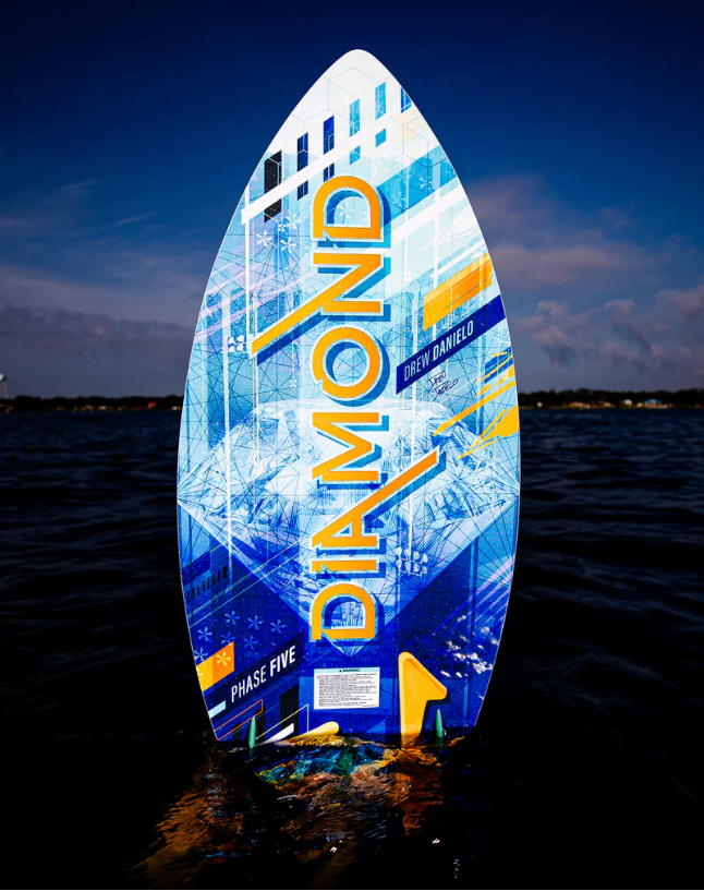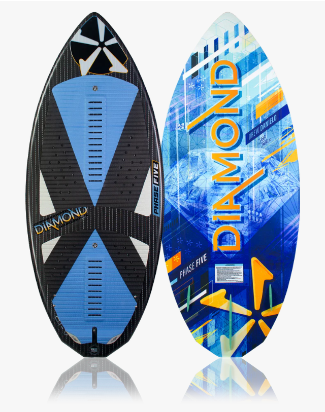 The Phase Five Diamond Turbo LTD Wakesurfer is built with a textured deck resulting in an extremely noticeable weight reduction for even more performance. You will notice the ChromaCarbon beautifully laminated into the deck. The bottom is built with Innegra for optimal speed and strength. The ChromaCarbon series are some of the best looking, high performing wakesurf boards produced by Phase Five to date. Features a three fin setup installed with our 2” Skim Fin in the center accompanied by 1” Fakie Skim fins on the outside.